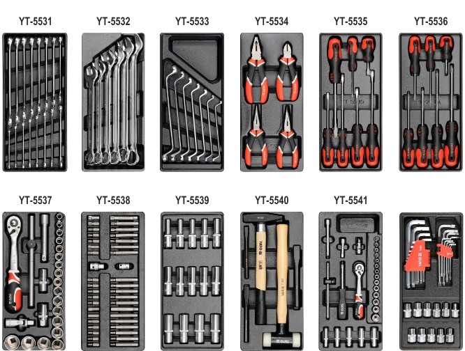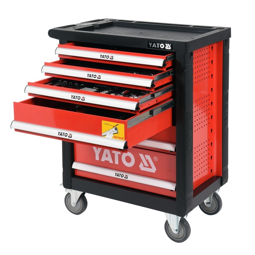 YATO szerszámszerviz szekrény. Rendelkezik 6 fiókkal zárszerkezettel, amelyek görgős sínre vannak szerelve – a 3 felső fiók teherbírása 25 kg, míg a 3 alsó fióké 35 kg. A szekrényt kényelmes fogantyúval és tartós, gumi kerekekkel szerelték fel, így annak mozgatása egyáltalán nem okoz gondot. A munkafelületet csúszásgátló anyaggal vonták be, ami megkönnyíti a szekrényen végzett munkát. Erős, víz alatti falak és ütközővel ellátott sarkok teszik a szekrényt tartóssá, stabilakká és ellenállóvá a sérülésekkel szemben. Jellemzők: kényelmes fogantyú erős, víz alatti falak centrális zár két kulccsal csúszásgátló munkafelület 6 tágas, zárral ellátott fiók teherbírással: 25 kg – 3 felső, 35 kg – 3 alsó 185 elem gumi kerekek, közül egy fékkel. széles görgős sín univerzális perforáció mindkét oldal golyós vezetőkkel van felszerelve sarok visszapattanókkal Fiókok tartalma: 1. fiók: Lapos végű kulcsok 6-21 mm, 16 darab (6, 7, 8, 9, 10, 11, 12, 13, 14, 15, 16, 17, 18, 19, 20, 21 mm) Lapos végű kulcsok 22-32 mm, 6 darab (22, 24, 27, 28, 30, 32 mm) Hajlított gyűrűkulcsok 6-19 mm, 7 darab (6×7, 8×9, 10×11, 12×13, 14×15, 16×17, 18×19 mm) 2. fiók: Csipesz, 4 darab (180 mm, 160 mm, 160 mm Hosszú Orr, 160 mm Hajlított Orr) Laposfejű csavarhúzók, 7 darab (3×75, 5×100, 5×150, 6×38, 6×100, 6×150, 8×150 mm) Gömbfejű csavarhúzók, 7 darab (PH0x100, PH1x75, PH1x100, PH2x38, PH2x100, PH2x150, PH3x150 mm) 3. fiók: Dugókulcs készlet, 24 darab ( 1/2” (12.7 mm): 10, 11,12, 13, 14, 15, 16, 17, 18, 19,20, 21, 22, 23, 24, 27, 30, 32 mm; – 1/2” (12.7 mm): 127 mm; – 1/2” (12.7 mm); – 1/2” (12.7mm): 255 mm 72T; – 1/2” (12.7 mm): 255 mm; – 1/2” (12.7mm): 16; 21 mm) Csavarhúzó végződések (bitek), 40 darab (H4, H5, H6, H7, H8, H10, H12 (L=30 mm); H4, H5, H6, H7, H8, H10, H12 (L=75mm); M5, M6, M8, M10, M12 (L=30mm); M5, M6, M8, M10, M12 (L=75mm); T20, T25, T30, T40, T45, T50, T55 (L=30 mm); T20, T25, T30, T40, T45, T50, T55 (L=75 mm); 1/2”(12.7 mm), 3/8”(9.5 mm)) Hosszú dugókulcsok 1/2′ 8-21 mm, 14 darab (1/2” (12.7 mm): 8, 9, 10, 11, 12, 13, 14, 15, 16, 17, 18,19, 20, 21 mm) 4. fiók: Kefe és vésők, 5 darab (Kalapácsok: 300 g (L=300 mm), fi40 mm (L=350 mm); Vésők: 10x8x142 mm, 12x10x152 mm, 16x13x170 mm) HEX kulcsok, TORX, dugókulcsok, 25 darab (1/2” (12.5 mm): E10, E12, E14, E16, E18, E20; 1/4”(6.3 mm): E4, E5, E6, E7, E8, HEX: 2, 2.5, 3, 4, 5, 6, 7, 8, 10, 12 mm; TORX: T10, T15, T20, T25, T27, T30, T40) Dugókulcs készlet, 30 darab (1/4”(6.3 mm): 3.5, 4, 4.5, 5, 5.5, 6, 7, 8, 9, 10, 11, 12, 13, 14 mm; 1/4” (6.3 mm): 8, 10, 11, 12, 13 mm; 1/4” (6.3 mm): 50.8, 101.6 mm; 1/4” (6.3 mm); 1/4”(6.3 mm): 155 mm; 1/4” (6.3 mm): 152.4 mm; 1/4”(6.3 mm): 150 mm) Használati figyelmeztetések: A kéziszerszámok használata veszélyes lehet! Mindig használjon személyes védelmi felszerelést a munka során. Csak megfelelő és sérülésmentes szerszámokat használjon. Válassza ki a szerszám típusát és méretét a tervezett alkalmazásnak megfelelően. Ne terhelje túl a szerszámokat. Tartsa a szerszámokat távol a gyermekektől. A szerszámokat megfelelő gondossággal használja.