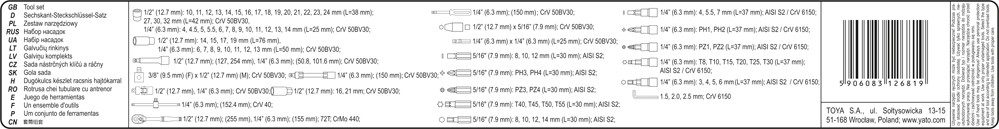 YATO – YT-12681 Dugókulcs klt. 94 részes 1/2 col: 10-32 mm, 1/4 col: 4-14 mm CrV ~