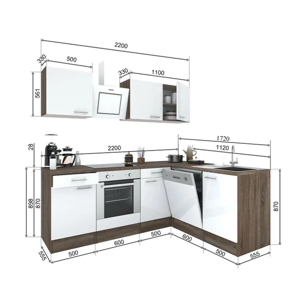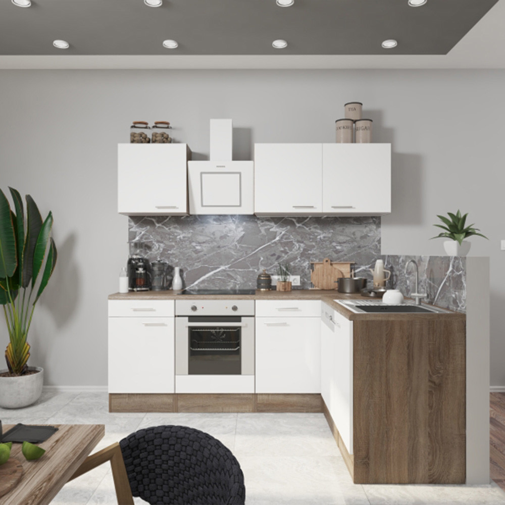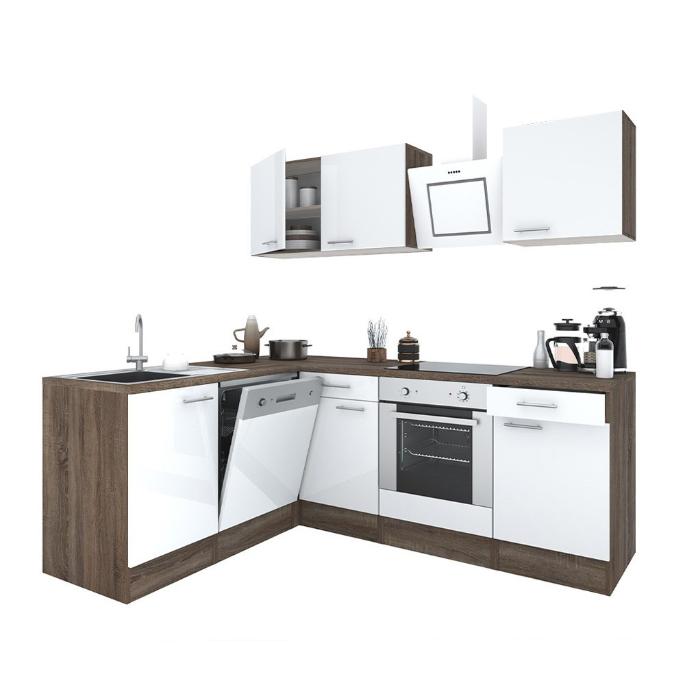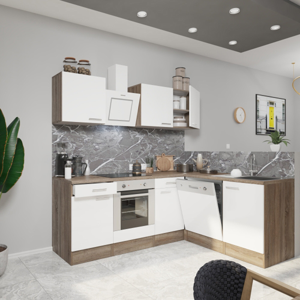 Yorki 220 sarok konyhablokk yorki tölgy korpusz, selyemfényű fehér fronttal. A tökéletes konyha megteremtője!