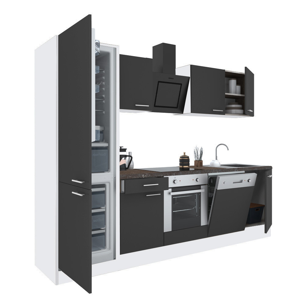 Yorki 280 konyhabútor fehér korpusz,selyemfényű antracit front alsó sütős elemmel alulfagyasztós hűtős szekrénnyel