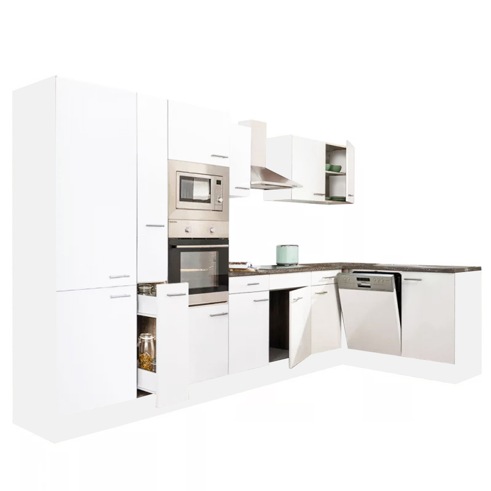 Yorki 370 sarok konyhabútor fehér korpusz,selyemfényű fehér fronttal polcos szekrénnyel